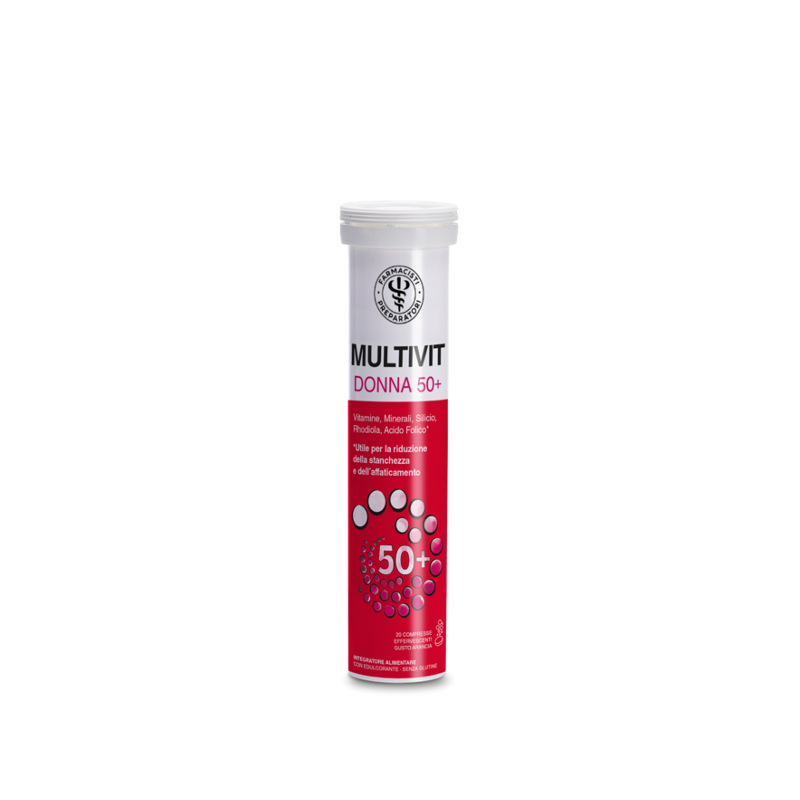 Integratore alimentare multivitaminico e multiminerale in compresse effervescenti gusto arancia, appositamente formulato per supportare le esigenze nutrizionali della donna dopo i 50 anni, più soggetta ad osteoporosi e disturbi della menopausa.