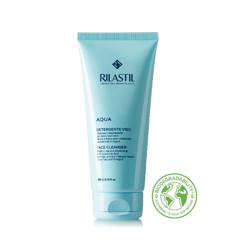 Rilastil Aqua Detergente Viso è un detergente fluido con pH fisiologico, adatto per tutti i tipi di pelle.