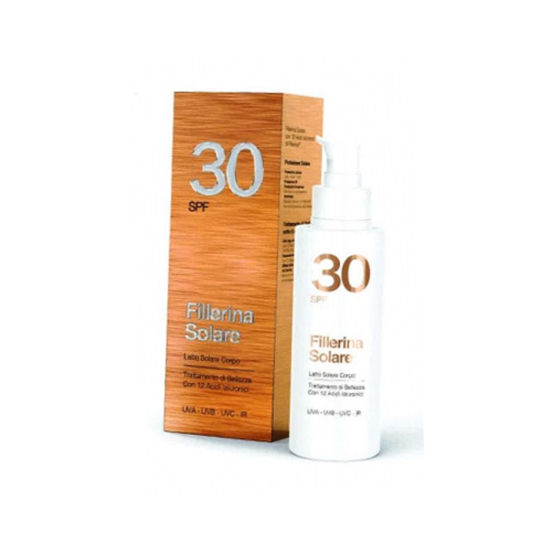 Fillerina Solare Protezione Corpo Spf30 150ml è un solare con fattore di protezione alta 30 che contiene i filtri solari a protezione estesa e svolge una difesa dinamica (filtri solari liberi e ciclodestrinati ) e più sicura contro i raggi UVA, UVB e UVC. E' anche un trattamento di bellezza con 12 Acidi laluronici.