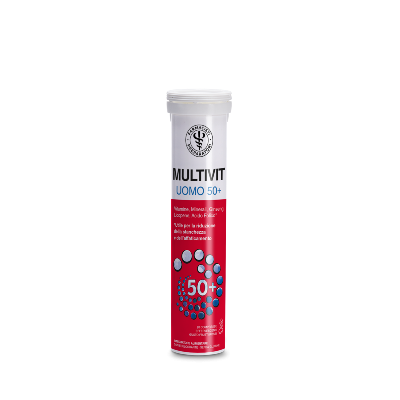 Integratore alimentare multivitaminico e multiminerale in compresse effervescenti gusto frutti rossi, appositamente formulato per supportare le esigenze nutrizionali dell’uomo dopo i 50 anni, più soggetto a rischi di eventi cardiovascolari e disturbi della prostata.