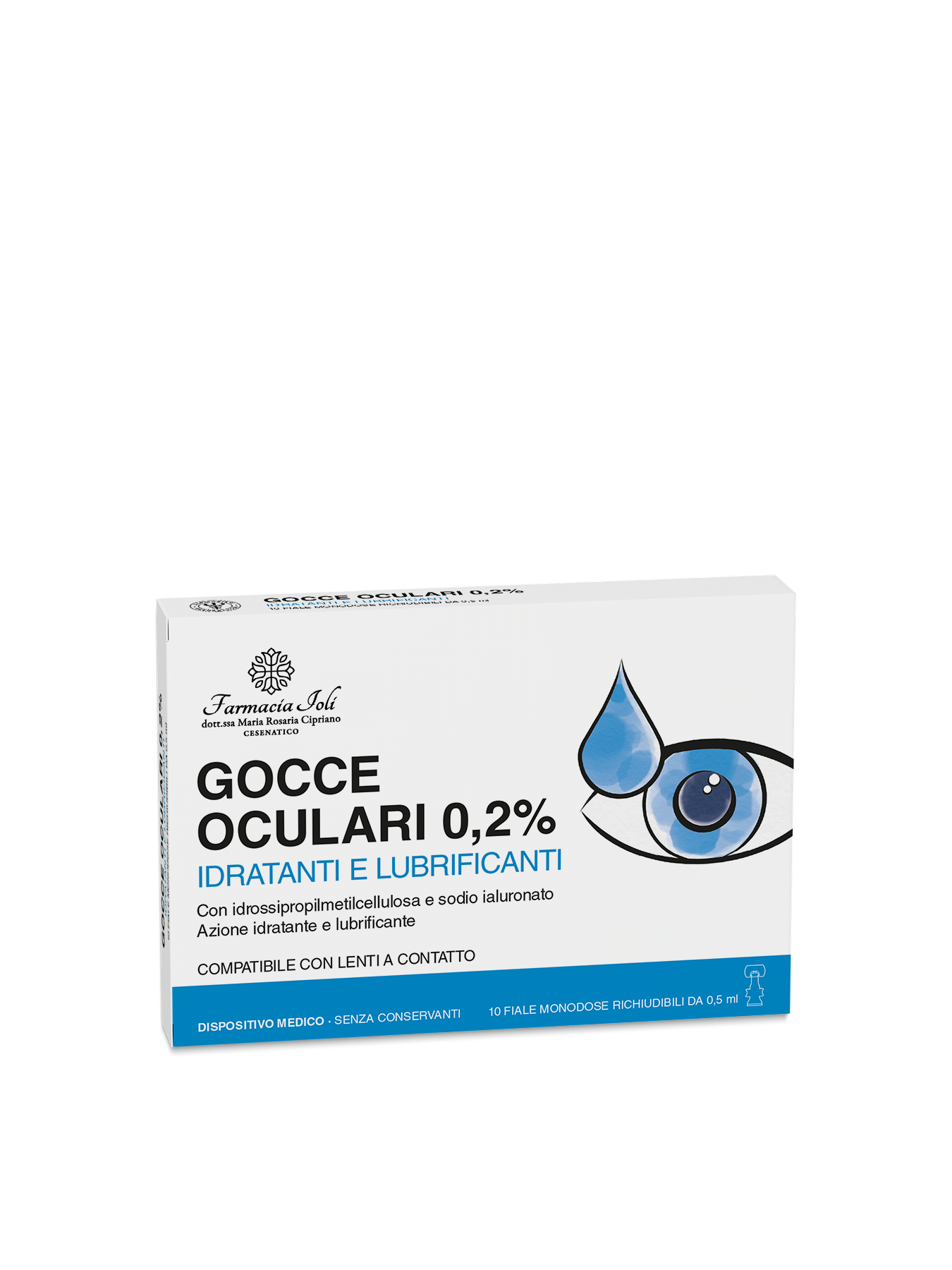 Gocce oculari ad azione idratante e lubrificante a base di sodio ialuronato e Idrossipropilmetilcellulosa.